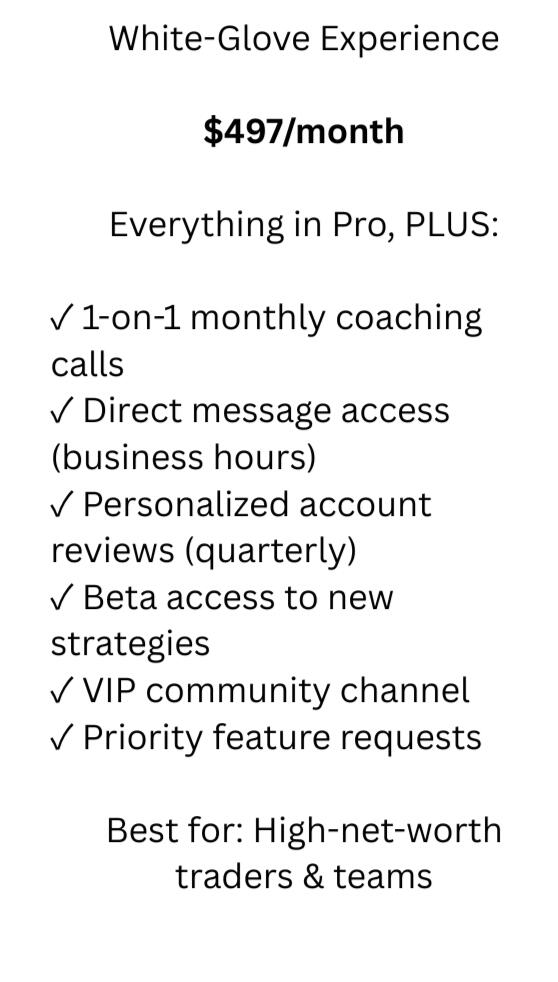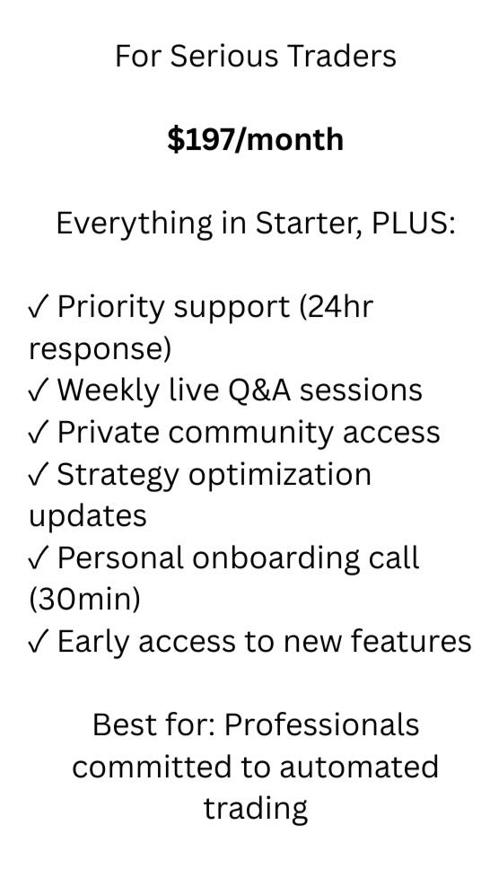 A: Yes. All trading involves risk of loss. While our strategy has proven results (65.6% over 9 months), past performance doesn't guarantee future returns. Never trade with money you can't afford to lose.Q: What's the guarantee?